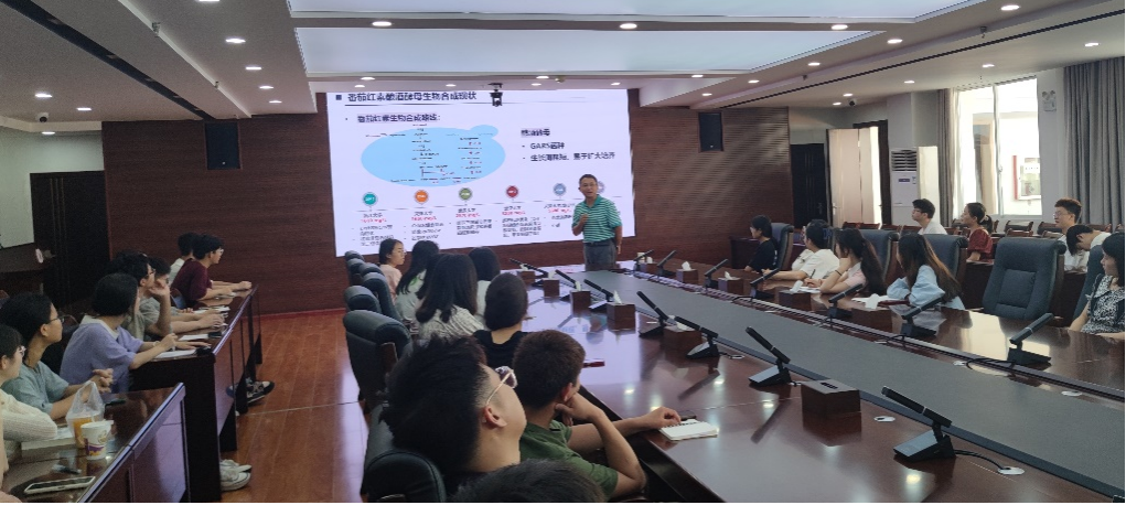 交流互动环节,22级研究生王横、23级生物科学曾正桥、陈缘和陈诗怡等同学分别就酵母发酵目标产物的提纯、CRTI酶反应时间长短、酵母的代谢途径、酵母发酵废物的再利用等问题进行探讨,肖教授一一耐心的进行了解答。