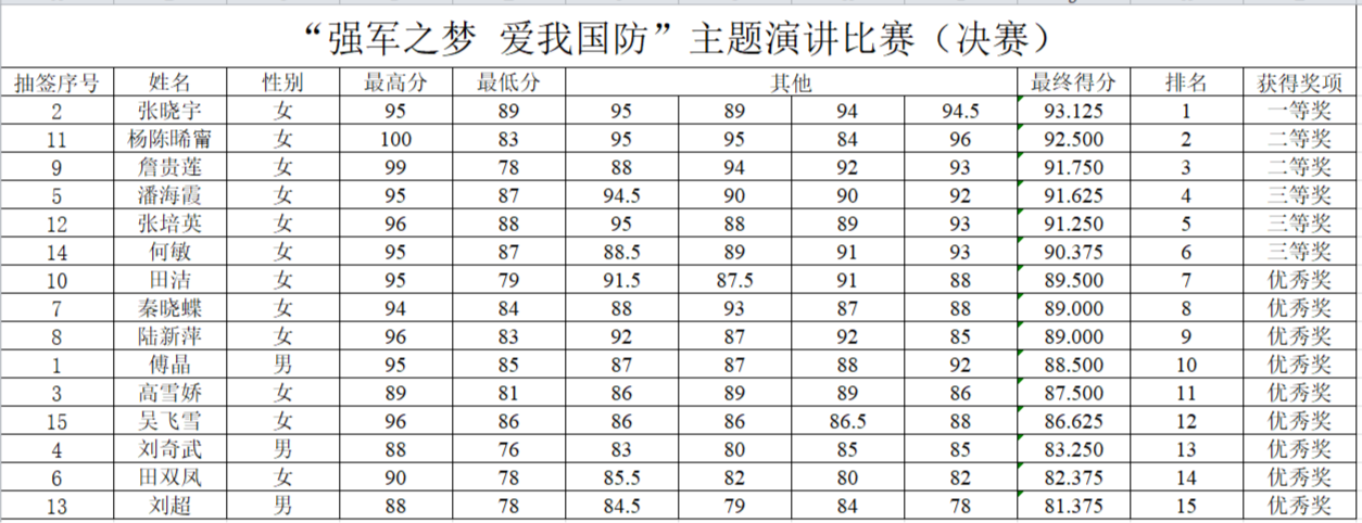 参加演讲比赛的共有15位选手,他们演讲的内容有的庄重严肃,有的激情豪迈,有的触动人心,有的感人至深。有的选手结合自身经历来激情讲述,或引经据典讲国防;有的选手结合讲述近代以来仁人志士为中华崛起而奋力求索的事迹,抒发对英雄先烈精神的理解感悟,各个精神饱满,慷慨激昂。他们从不同视角,不同方面娓娓道来自己的中国梦,强军梦,国防梦。