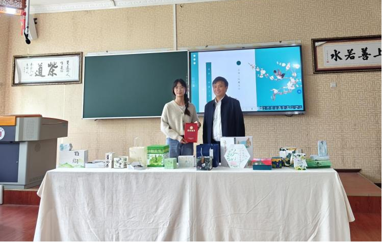 参赛选手按线上抽签的顺序依次上台介绍自己作品的设计理念,评委老师从理念构想表达、 搭配视觉设计、信息传达能力、 实用性四个方面对作品打分。统分环节老师和选手们近距离观赏和点评参赛作品,给同学们进一步改进提升作品提出了意见和建议。15组选手经过激烈角逐,最后决出一等奖一名,二等奖三名,三等奖五名。2022级茶学专业王婷、王华强为瀑布毛峰茶设计的作品《茶溢瀑乡》获得第一名。获得二等奖的作品分别是2022级茶学专业张雕雕与2022级学前教育专业叶雨彤合作的《静心茗香》、2022级学前教育专业龙黎、罗报兰合作的《茶香一路,醇厚万里》、2022级茶学专业郭兴美和王清合作的《东方美人》。另有2023级通信专业、2023级环境艺术设计专业、2022级美术学等专业同学设计的五组作品获三等奖。