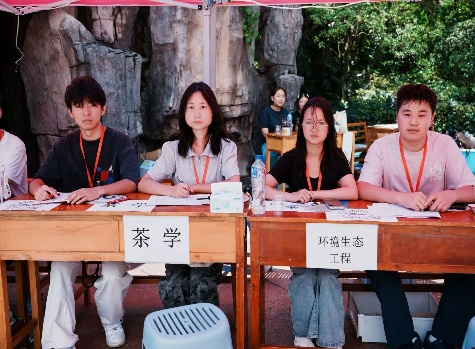 茶学、环境生态工程生物工程的员工骨干在迎新咨询服务点,为新生及家长详细介绍专业培养方案、课程设置、就业前景等内容,耐心解答各类疑问,帮助新生快速了解专业方向。